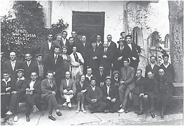 Вот типичный коллективный снимок того времени. В крымском санатории, на экскурсии в Ялте. Ноябрь 1936 года. Папа сидит на первом плане (четвертый слева)