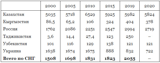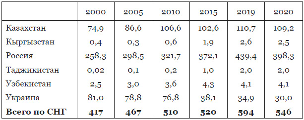 За последние два десятилетия наблюдался постоянный рост добычи угля в целом ряде стран СНГ. Лишь 2020 год свидетельствует об определенном спаде добычи и по СНГ в целом, и в главных угледобывающих странах – России и Казахстане. Что касается Украины, то резкий спад производства угля в стране проявился в последние десять лет и сократился с 76,8 млн. тонн в 2010 г. до 30,0 млн. тонн в 2020 г. Вместе с тем, все угледобывающие государства – члены Содружества в настоящее время добывают свыше полмиллиарда тонн угля в год и за последнее двадцатилетие рост добычи составил около 31 %, в доковидном же 2019 году этот рост по сравнению с 2000 годом составил 42,4 % Больше всего на душу населения производит угля Казахстан, на втором месте по этому показателю – Российская Федерация, на третьем – Украина. А в целом на долю угольной промышленности Российской Федерации в настоящее время приходится около 73 % всего угля, добываемого в странах СНГ, доля Казахстана составляет около 20 %, Украины – 5,5 %.