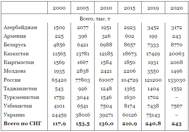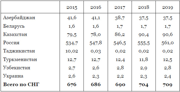 За эти годы страны СНГ стабильно добывали около 670–700 млн. тонн нефти и газового конденсата в год. Производство этого продукта постоянно росло в Российской Федерации и Казахстане и незначительно снизилось в 2017–2019 годах в Азербайджане. Удельный вес добытой российскими нефтяниками нефти составил по состоянию на 2019 г. более 79 %, Казахстанская нефть составила – свыше 13 %. А на долю Азербайджана приходилось около 5,3 % всей добываемой странами СНГ нефти.