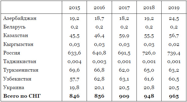 Четверть всего газа, добываемого в мире, приходится на страны СНГ. Лидер по производству газа Российская Федерация. См. таблицу 6. На ее долю приходится по состоянию на 2019 год 76,6 % добычи. Три страны СНГ производили примерно равный объем газа – Туркменистан, Узбекистан и Казахстан. На долю этих центральноазиатских республик приходилось 18,7 % добытого в СНГ природного газа, 24,5 млрд. кубометров газа добыто было Азербайджаном.