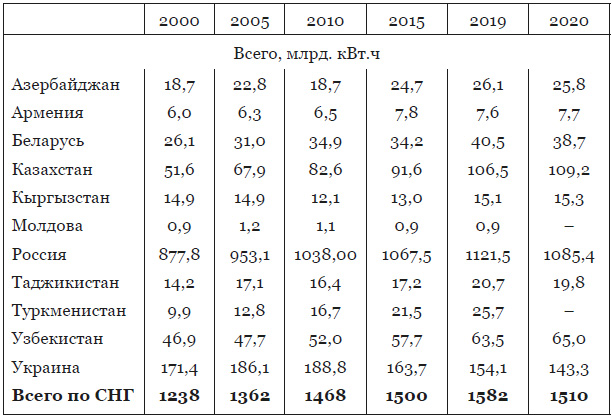 В целом страны СНГ демонстрируют постоянный рост производства электроэнергии. Существенен он и в промышленной продукции целого ряда стран – Российской Федерации, Казахстана, Беларуси, Узбекистана, Туркменистана. Определенный прирост производства электроэнергии демонстрировали и такие страны как Таджикистан. Небольшие показатели прироста производства электроэнергии имели место в Армении и Кыргызстане. Отрицательная динамика проявила себя на Украине и практически не росло производство электроэнергии в Молдове.