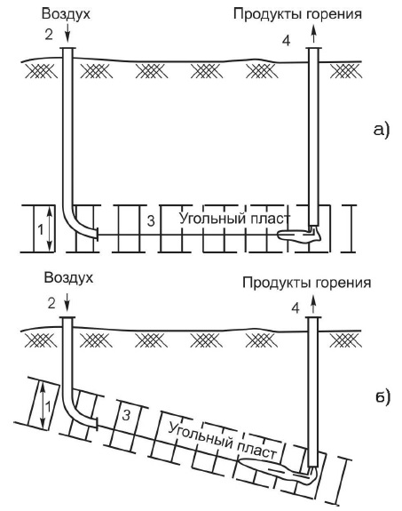 На угольный пласт 1, подлежащий дегазации, бурят вертикально- (наклонно-) горизонтальные (наклонные) скважины 2. Необсаженная часть этих скважин 3 может быть выполнена горизонтальной или наклонной. На дальний конец бурового канала 3 бурят вертикальную скважину 4. Скважину 4 соединяют с буровым каналом 3 методом гидроразрыва, после этого в первой из них разжигают угольный пласт. В скважину 2 нагнетают воздушное дутье, а скважину 4 открывают в атмосферу. Очаг горения начинает перемещаться по буровому каналу 3 навстречу нагнетаемому в скважину 2 дутью.
