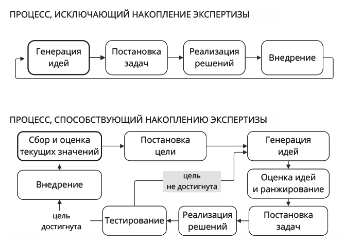 Невооруженным глазом видно, что, в отличие от первого процесса, представляющего собой линейную цепочку действий, второй подход более структурирован и ориентирован на достижение цели. Он включает в себя этапы сбора данных, оценки идей и тестирования, что позволяет учитывать результаты и корректировать направление работы.