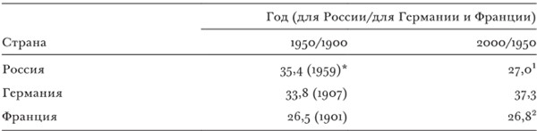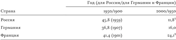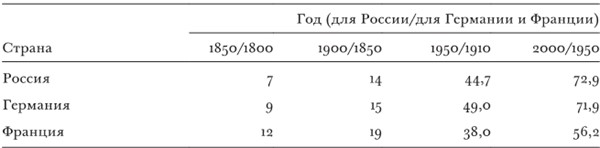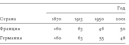 Сравним длительную эволюцию ВВП России и двух стран континентальной Европы. Франция и Германия наилучшим образом подходят для сравнительной оценки, поскольку они, как и Россия, дважды за прошедшее столетие стали аренами мировых войн, которые оказали негативное влияние на развитие всех трех стран. Приведенные данные (табл. 1.13–1.16) показывают, что отставание России от Германии и Франции по душевому ВВП было достаточно стабильным на протяжении примерно полутора веков.