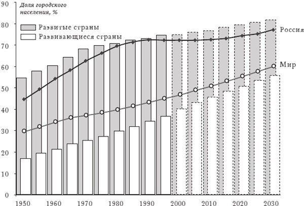 РИС. 1.2. Рост доли городского населения во второй половине XX в. и прогноз ООН до 2030 г., %