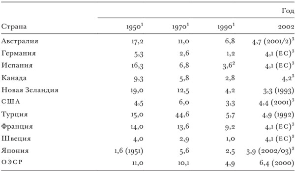 Страны-лидеры извлекли уроки из предшествующего периода кризисного развития. В рамках Генерального соглашения о тарифах и торговле они предпринимают согласованные усилия по снижению уровня тарифной защиты, либерализации мирового рынка, отказываются от прежней политики, направленной на жесткое ограничение тарифного суверенитета менее развитых стран; они признали свою ответственность за либерализацию мировой торговли и предоставили развивающимся странам широкие права на таможенную защиту. Средний таможенный тариф в странах ОЭСР снижается с почти 11 % в 1950 году до 6 % в конце XX в. Еще более разительными оказываются эти перепады по отдельным странам – членам ОЭСР (табл. 3.2).