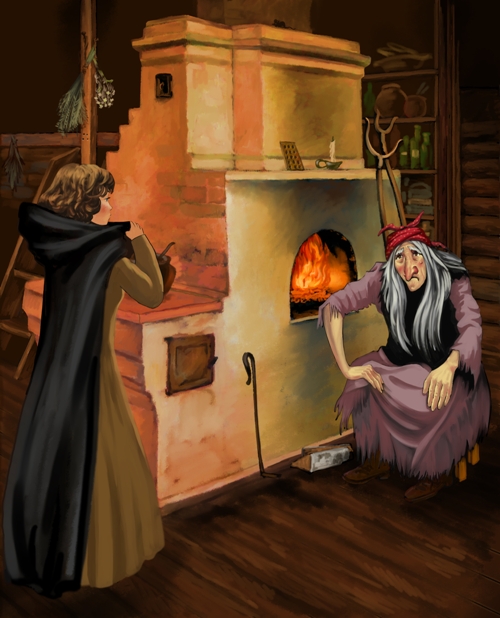 В доме было жарко натоплено, трещали дрова, и огонь колыхался по стенам багровыми отблесками. У очага сидела горбатая старуха с крючковатым большим носом в бородавках, седая и безобразная, в цветастом халате. Она заскрипела недовольно: