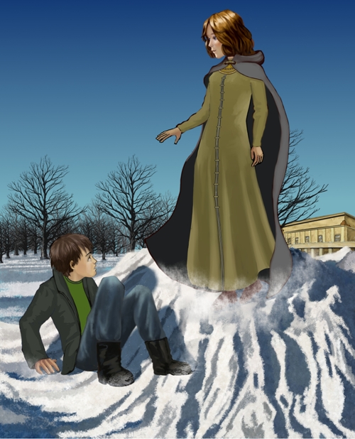 Небо затянули сиреневые сумерки, зажглись в парке фонари. Тянуло влажным весенним ветром. Полетел лёгкий, словно пух, снежок. Автомобили на дороге разъехались куда-то. Было безлюдно и тихо.