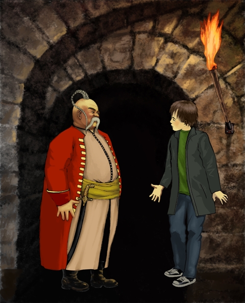 У массивного бревенчатого стола стоял толстый старик в красно-белом одеянии, напоминающем одновременно и пальто, и гусарский мундир. Одеяние это подпоясывал широкий ремень, на ремне висела устрашающих размеров кривая сабля в черных ножнах. Старик был совершенно лыс, только на макушке его светилась серебром седая прядь, сплетенная в косицу. Косица эта, за ухо заложенная залихватски, сбегала по его плечу вниз и терялась в длинных белых усах, свисающих уныло, словно у диковинной печальной рыбы.