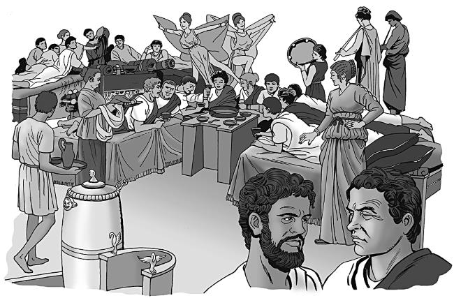 У древних греков была особая культура застолий. Они прославились ею не меньше, чем своими философами и государственными мужами. Дома в Древней Греции были очень скромно обставлены, но одним из важнейших предметов меблировки являлось трапезное ложе, возлежа на котором греки вкушали пищу. Однако правом на столь вольготное возлежание пользовались только мужчины, женщины сидели на стульях. Основное время трапез наступало вечером, завтрак и обед были скудными. Кушанья сервировали на маленьких столиках перед ложами. Миски и чаши для напитков были из глины или стекла. Ложки были редкостью, поэтому суп ели, макая в него кусок хлеба, а остальную пищу брали руками. Основными продуктами питания были хлеб и выпечка, рыба и овощи. Мясо ели редко. Вся еда обильно сдабривалась острыми приправами. Жажду греки предпочитали утолять вином, разбавленным водой. После еды мужчины собирались на вечеринку, называвшуюся симпозиумом. Они пускали по кругу большую чашу с вином и наслаждались игрой девушек-флейтисток.