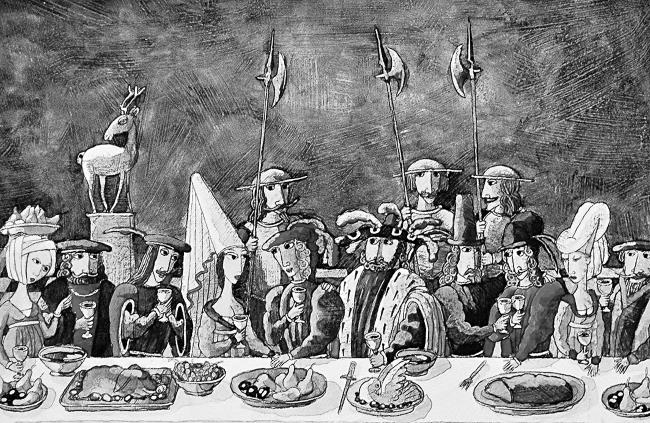 В ритуал превратил застолье Карл, прозванный Великим, – VIII век. Он решил возродить древние традиции римлян и греков. Во время еды он предпочитал либо слушать музыку, либо приглашал чтецов, чтобы они читали вслух. За столом были прислуживающие, кравчий и стольник. Зал украшали. Ковры, свечи, шкуры животных, простая меблировка, как столы, скамьи – всё было готово для праздника по первому требованию. Посуда была сделана из золота. Зато ели чаще всего ножом. Привилегия пользования ложкой принадлежала исключительно правителям. Пили вино. Танцовщицы, певцы, шуты – развлекали гостей. После праздника, прощаясь с гостями, Карл преподносил им богатые подарки.