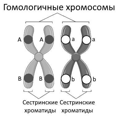Сначала цитологическое объяснение данного закона. Перед началом мейоза (то есть, перед началом образования гамет) хромосомы удваиваются: каждая хромосома состоит из двух сестринсикх хроматид, образуя Х-образную фигуру. Хромосомы всегда ходят парами, потому что в одной хромосоме находится одна аллель гена, в другой хромосме – вторая аллель гена. Посмотрите на картинку ниже – здесь изображены две гомологичные (парные) хромосомы, в каждой из которых по одной аллели гена двух признаков: A и B или a и b.