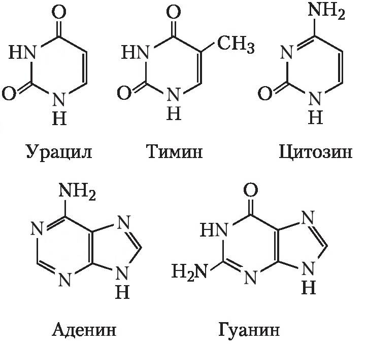 Азотистые основания – сложные циклические соединения, содержащие в своем составе азот. Знать их формулы не нужно, достаточно знать названия.
