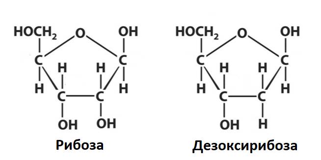 Пентоза – это пятиуглеродный моносахарид. В случае РНК это будет рибоза (оттуда и название РНК – рибонуклеиновая кислота), в случае ДНК – это будет дезоксирибоза (оттуда и название ДНК – дезоксирибонуклеиновая кислота). Знать их формулы не нужно, но названия выучить придется.