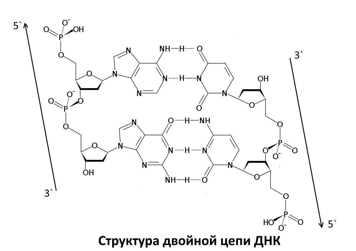 Водородные связи между двумя цепями обозначены пунктиром. Обратите внимание на то, что одна цепь перевернута, то есть, «идет в противоположную» сторону. Важно запомнить одну вещь, которая очень пригодится в будущем: каждая цепочка начинается с фосфатной группы (это 5`-конец), а заканчивается OH-группой (это 3`-конец), причем обе цепи идут в разные стороны, это называется «антипараллельностью».