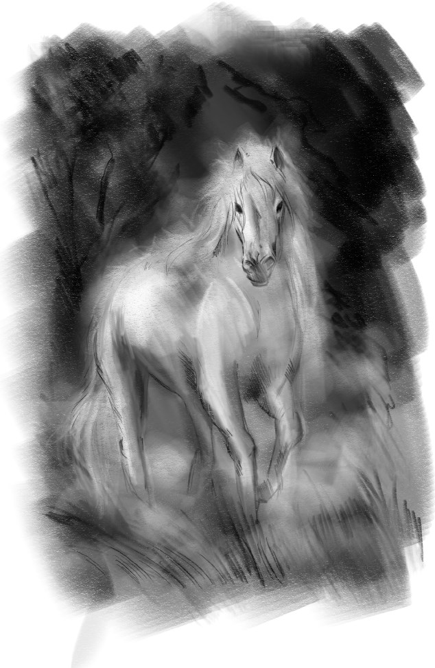 И тут вижу: вышагивает белоснежный конь, красавец, мне навстречу. Такой белизны и чистоты вовек глаз мой не видывал! Думаю я: что за чудо такое? Да ненароком вспоминаю рассказ мамкин, вздрагиваю. Но не верится ведь молодому лбу, что призрачный конь это, а не обычный! Подхожу я к животине, говорю ласково: