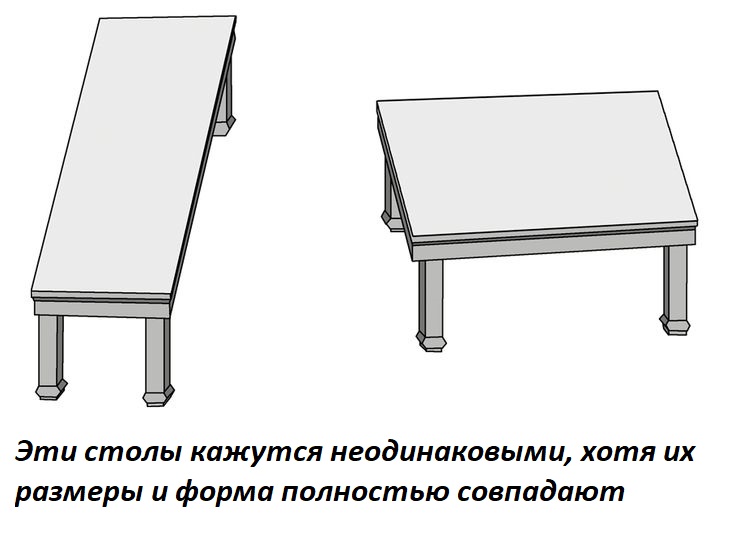 Я очень люблю показывать именно этот пример студентам на лекциях. И всегда доходило до того, что просто принять этот факт им было невозможно, приходилось прикладывать линейку и промерять столы, чтобы убедиться в том, что отказывалось принимать сознание: они все-таки одинаковы (ну, кто из вас тоже пошел искать линейку?).