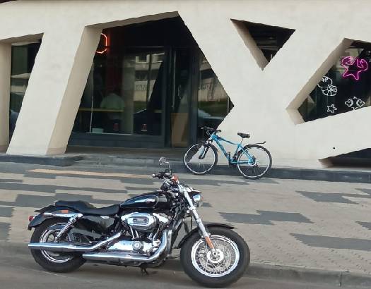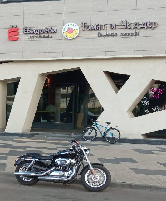 Нет, можно, конечно, и не заметить главного на этой фотографии. Можно увидеть мотоцикл, наверное, неплохой. А можно ещё обратить внимание на стоящий сзади велосипед. Всё это даже наталкивает на мысли о технологиях и прогрессе. Вполне вероятно, я сделал эту фотографию из-за интересного архитектурного решения. Но если бы эти две догадки были верны, фотография выглядела бы так: