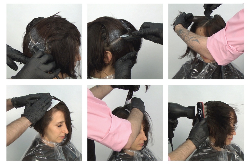· Советуем наносить краситель сначала на зоны с повышенным процентом седины (в нашем случае – от лица). Нанесение только на корни волос.