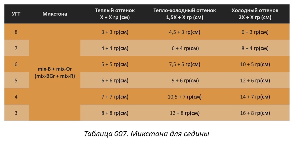 От 11 отнимаем желаемый уровень глубины тона и получаем количество микстона в граммах или сантиметрах (зависит от желаемой плотности) из расчёта на 30 г красителя. Расчёт ведётся на каждый цвет микстона! Для упрощения все значения внесены в таблицу, показанную ниже.