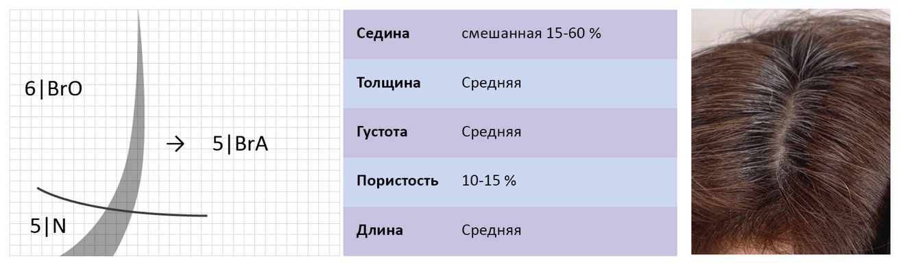 · У нашей клиентки седина смешанного характера и была распределена от 15 до 60 %. Выделить чёткие очаги сложно, зоны перетекают относительно равномерно от затылка к лицу с увеличением процента. Это обусловило нанесение красителя с лицевой части. То есть с участков, имеющих большую концентрацию седины.
