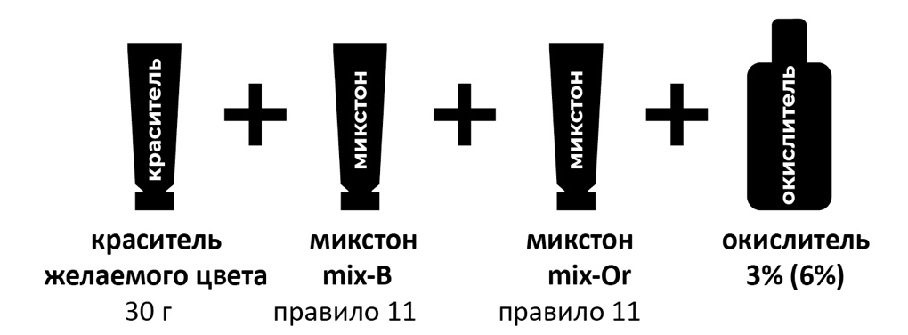 Для вычисления количества микстона необходимо использовать «Правило 11». При этом нужно отметить, что для усиления плотности (используется при тёмных цветах темнее 5 УГТ) микстона рассчитываются в граммах, а в ходе работы с нормально окрашиваемой и светлой сединой расчёт выполняется в сантиметрах на 30 г красителя без учёта окислителя: