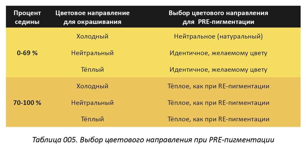 Нужно отметить, что при работе с сединой более 70 % в качестве цвета PRE-пигментатора вам нужно брать тёплые цветовые направления в золотистом, золотисто-оранжевом или коричневом спектре с насыщенностью не менее 3 степени. В противном случае данные участки будут получаться более холодными и будут отличаться от основной массы окрашенных волос. При седине до 70 % вы можете использовать натуральные цвета или цвета, соответствующие тем, которые вы используете в окрашивании.