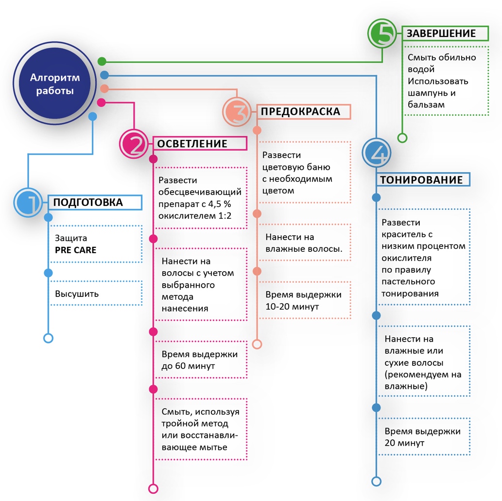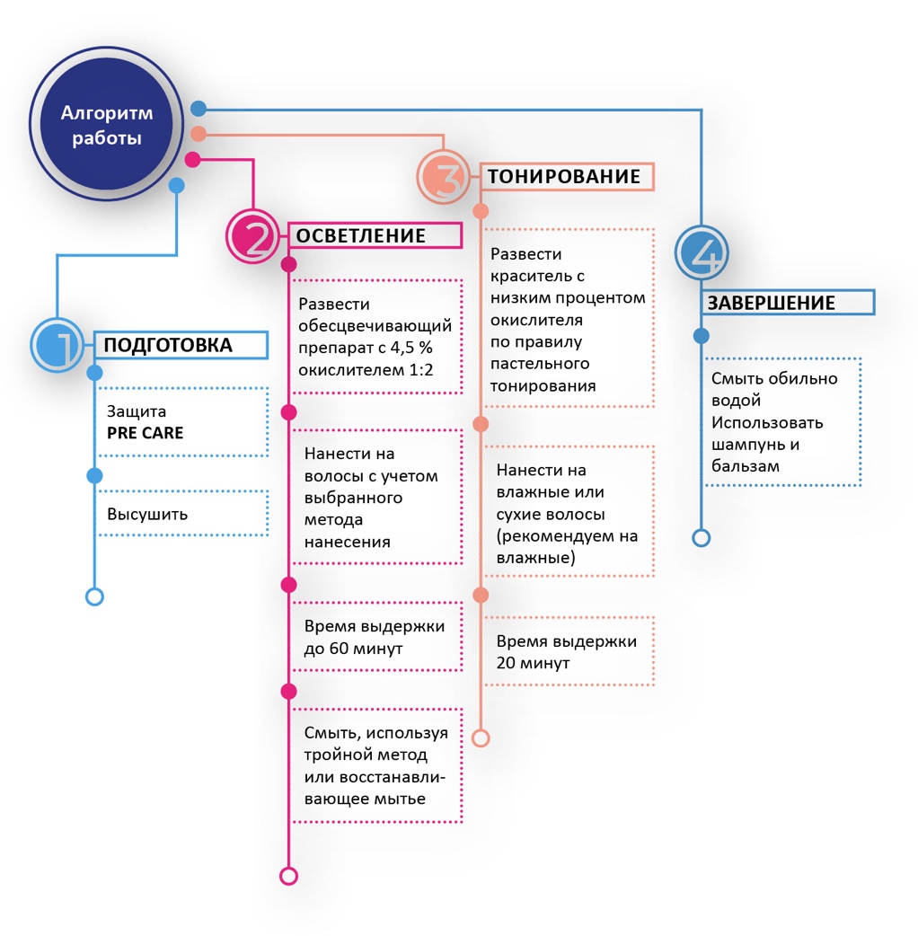 · Обесцвечивание лучше всего выполнять на сухие волосы. Поэтому после процедур защиты PRE CARE высушите волосы. Обесцвечивать на влажных волосах можно, однако это сильно снизит скорость осветления.