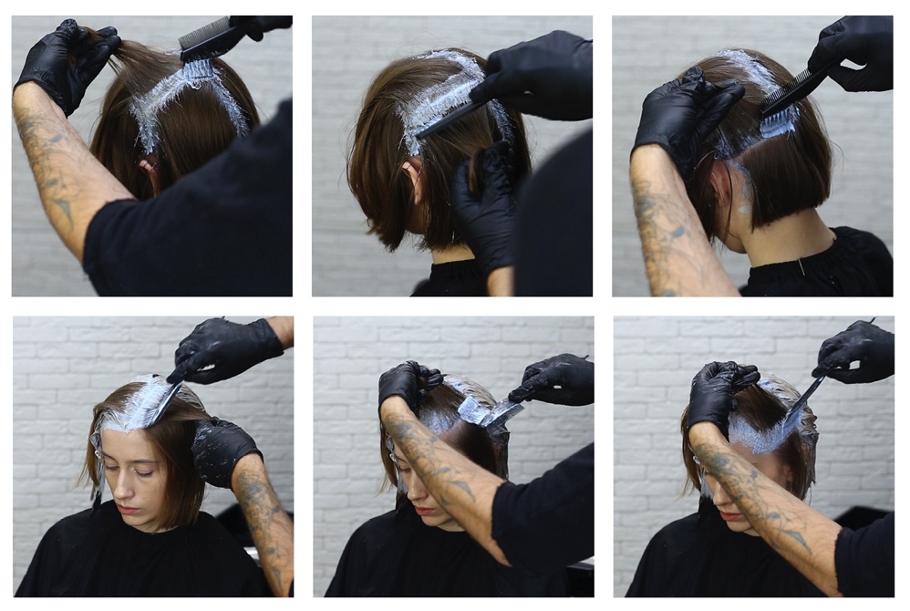 · Нанесите обесцвечивающую смесь на длину волос, двигаясь снизу вверх. (Наносите, чётко отступая на 1 см от корней, то есть не создавайте смахов, зигзагов и растяжек.)