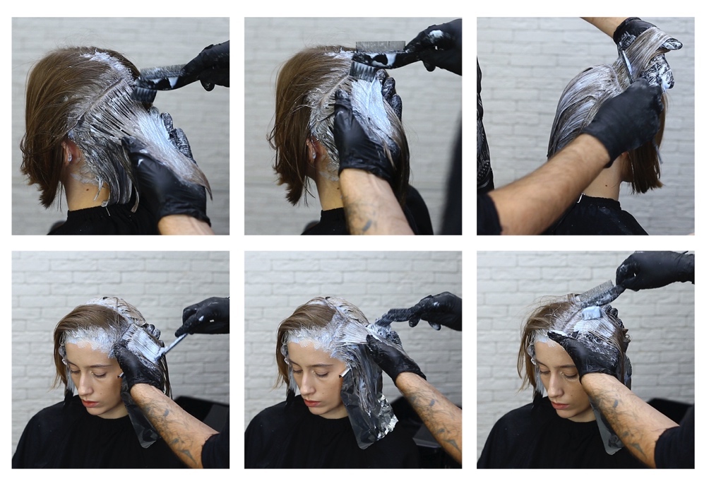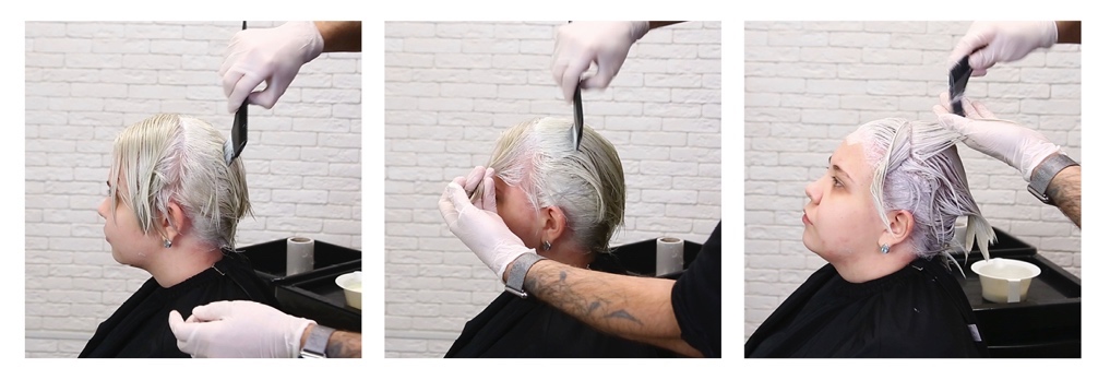 · Сразу, как дошли до нижней точки зоны, наносите снизу-вверх вторую обесцвечивающую смесь на длину волос.