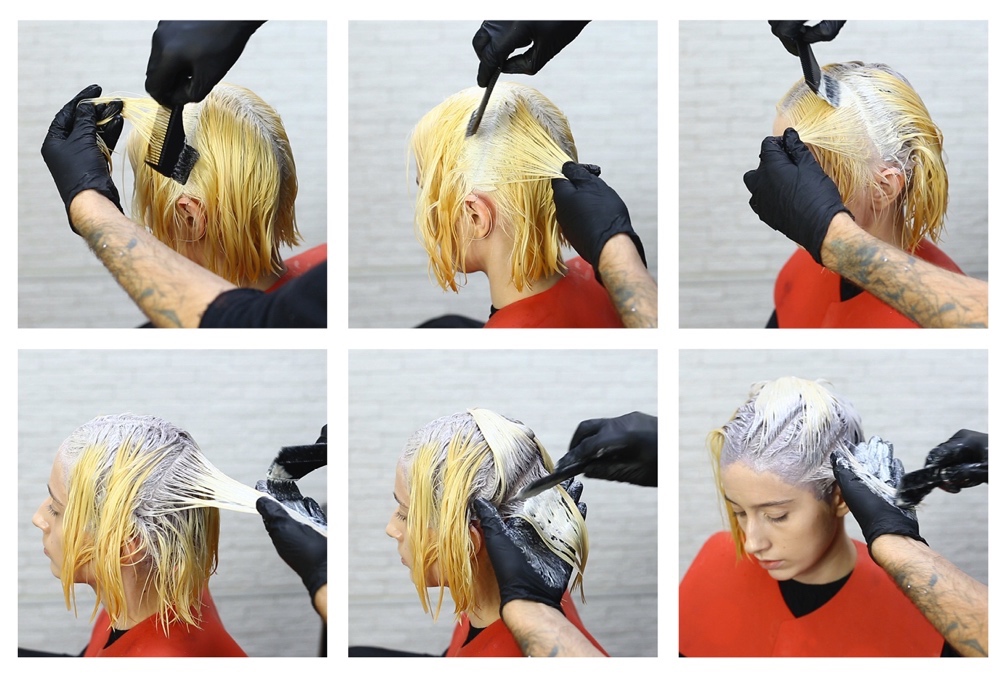 · При нанесении старайтесь не наносить активно обесцвечивающий препарат на уже нанесённые участки волос. (Это может усилить действие в данных участках осветления, и вы получите переосветлённую прикорневую зону.)