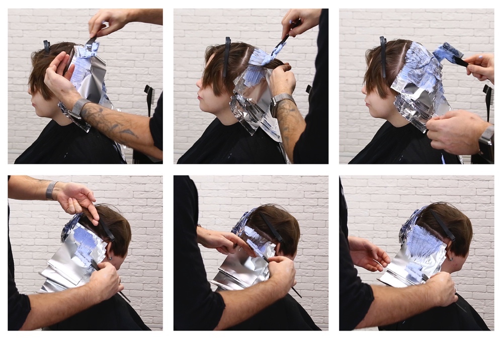 · Ещё один нюанс: краевую роста и верхний пробор закройте фольгой или плёнкой. Поскольку в этих местах мало красителя, и они контактируют с воздухом, осветление проходит в них хуже, чем в участках внутри зон.