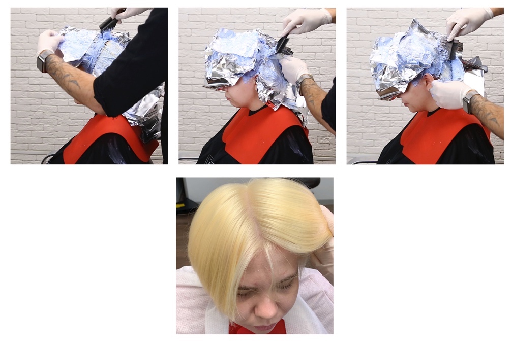 · Работать нужно скоростным способом. Он подходит для кавказского типа волос. Однако если вы работаете с азиатскими волосами, то лучше так не выполнять обесцвечивание. При работе с азиатскими волосами используйте следующий пример как эталон работы.