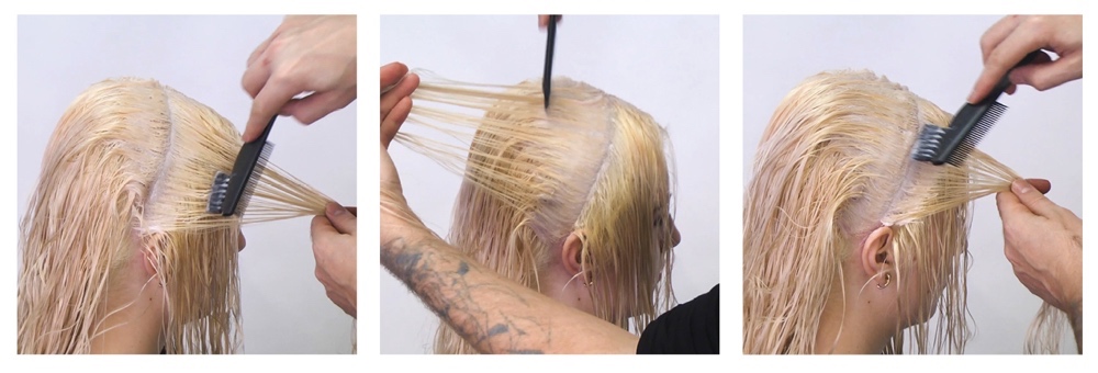 · Тонирование нужно выполнять по технологии объёмного 3D блонда. Подходить к этому можно с разных сторон и выделять различный метод прядей, однако мы демонстрируем самый быстрый и эффективный метод на диагональных проборах, чередуя пластины цвета.