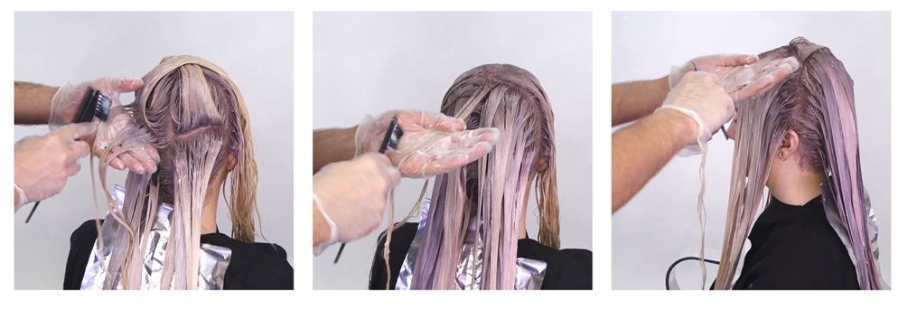 · Краситель нанесите методом Total Blonde. То есть нанесите сразу на всю длину. Для ускорения нанесения вы можете нанести сначала на корни и потом нанести на длину, работая по блокам, как во втором этапе работы.