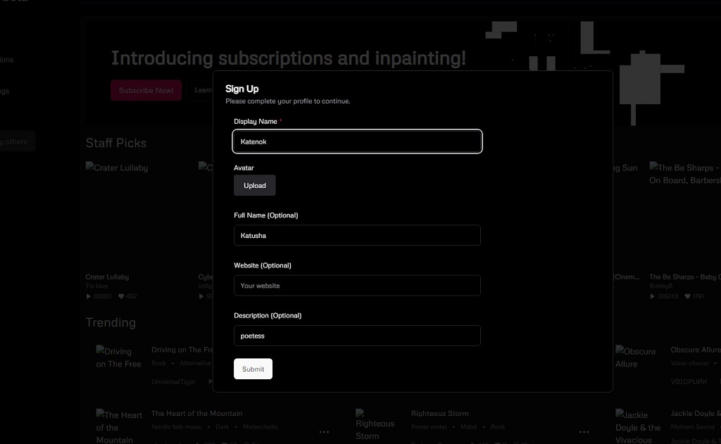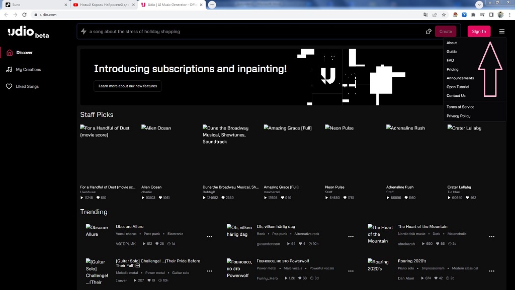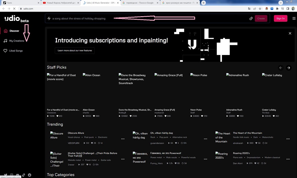 Итак, «Юдио». Пока – в пробной версии – доступны 1200 генераций песен за месяц. И возможность создать 10 мелодий в день. Регистрация происходит через гуглпочту либо через «Дискорд».