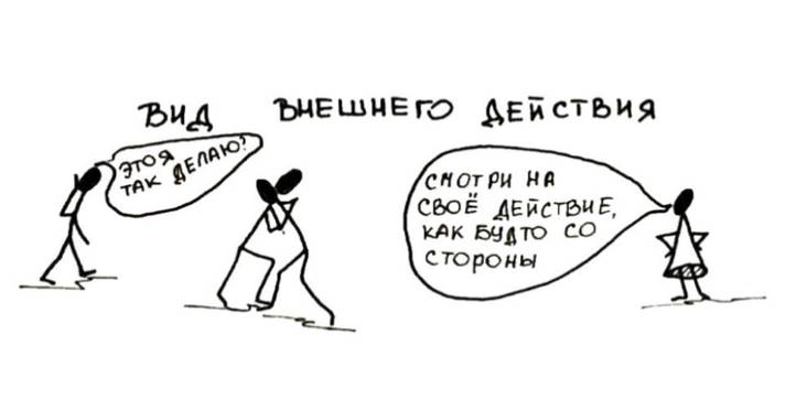 Первый шаг – это представить действие снаружи, как оно выглядит, когда ты его выполняешь. Если сложно представить, попроси кого-нибудь снять тебя на видео и посмотри, как ты это делаешь. Или найди в интернете видео, как это действие делает ведущий спортсмен. Постарайся увидеть эту картинку максимально чётко, будто смотришь кино в своей голове.