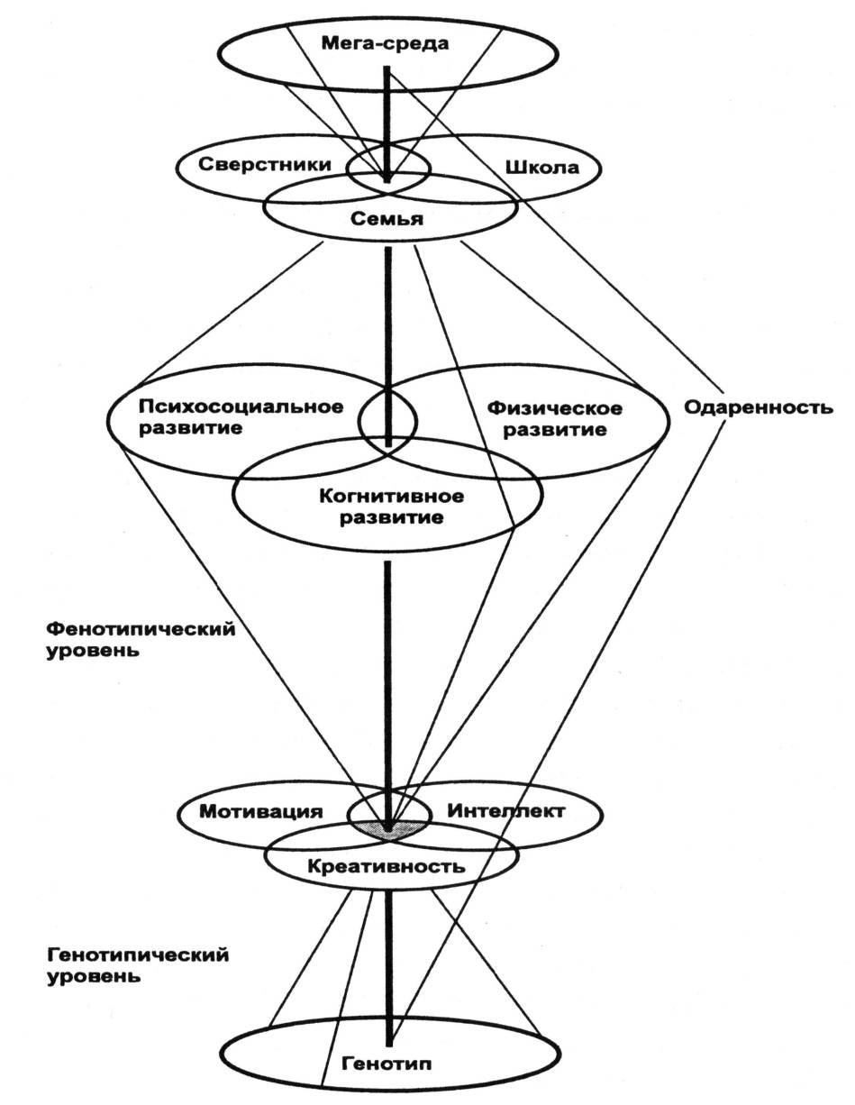 Объединение нескольких современных концепций одаренности в интегративную модель было предложено А.И. Савенковым [113]. Одаренность представлена в виде вертикальной оси (рис.1), пронизывающей характеризующие ее уровни, выделенные А.И. Савенковым условно. Ось ограничена, с одной стороны, «мега-средой», с другой, – «генотипом».