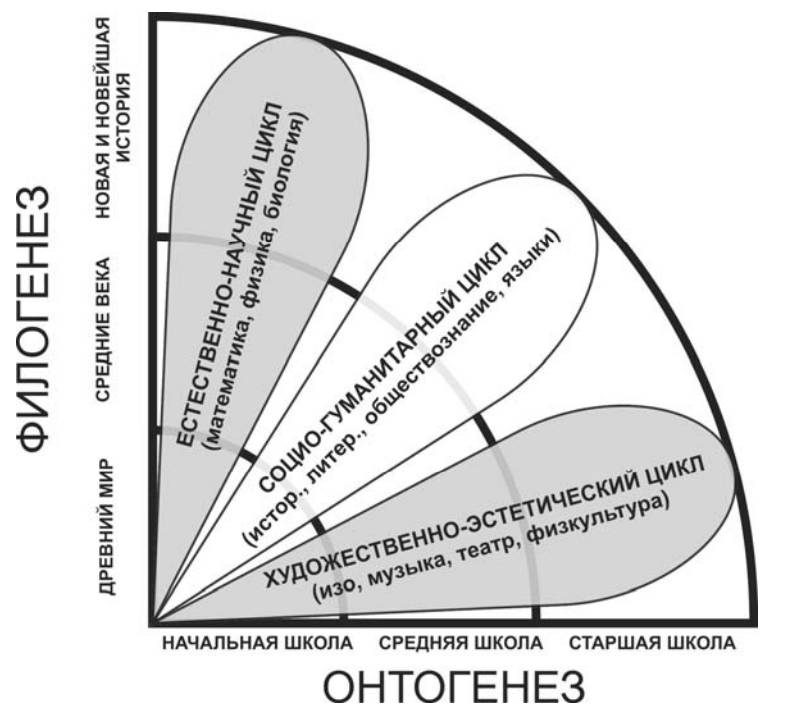 4. Одним из концептуальных оснований культуротворческой школы А.П. Валицкая считает принцип построения учебного процесса в зависимости от возраста учащихся (рис. 2). Так, для учащихся средних классов важен эмоционально-образный тип мироотношения, способность ценностного переживания жизни и учебного материала, необходимо опираться на стремление подростков к независимости, с одной стороны, и учитывать их желание принадлежать к социальной группе, с другой стороны [27].