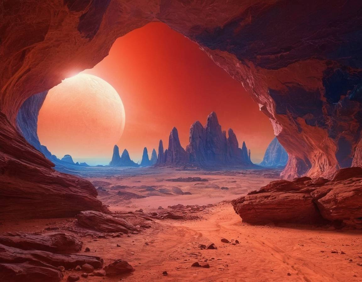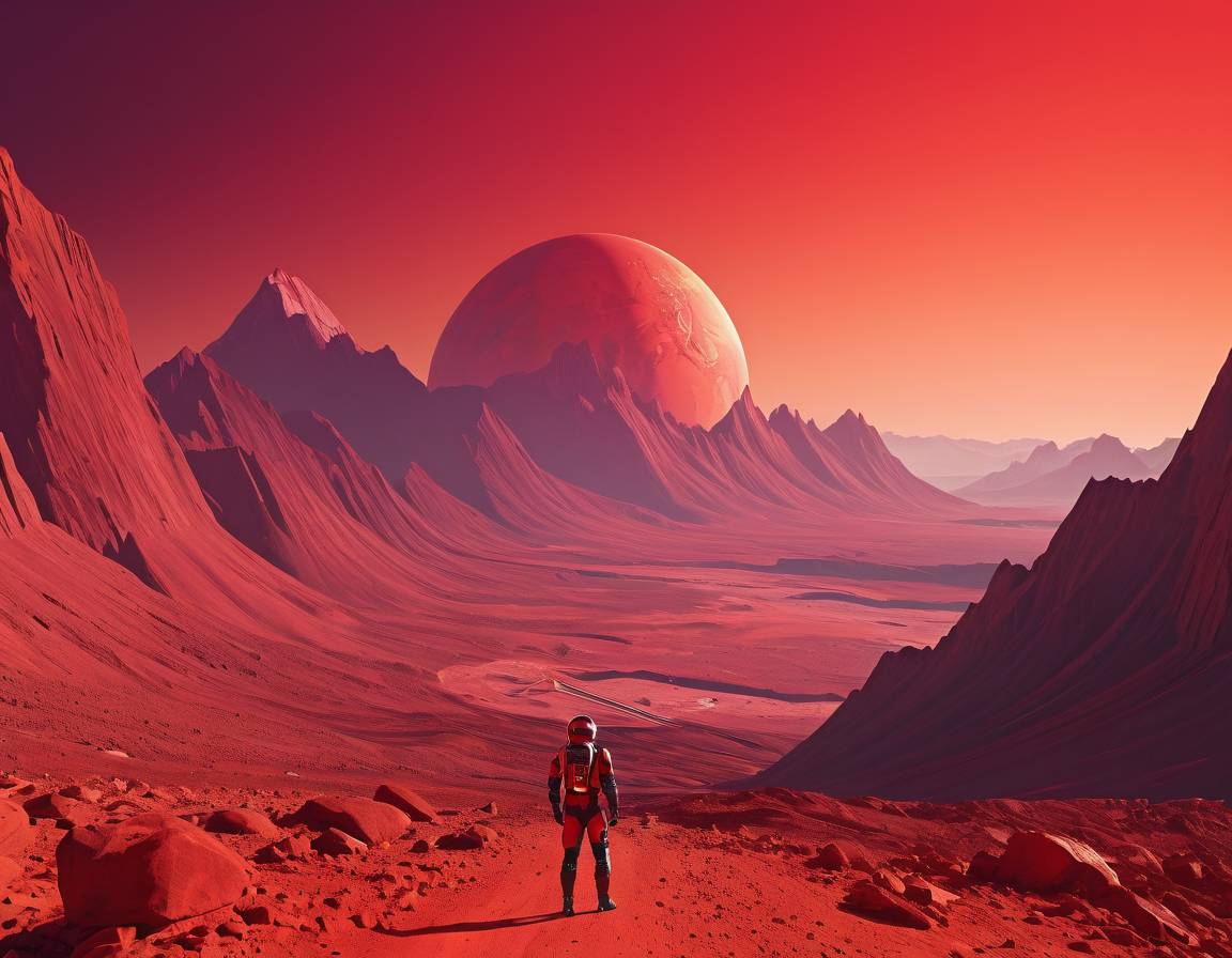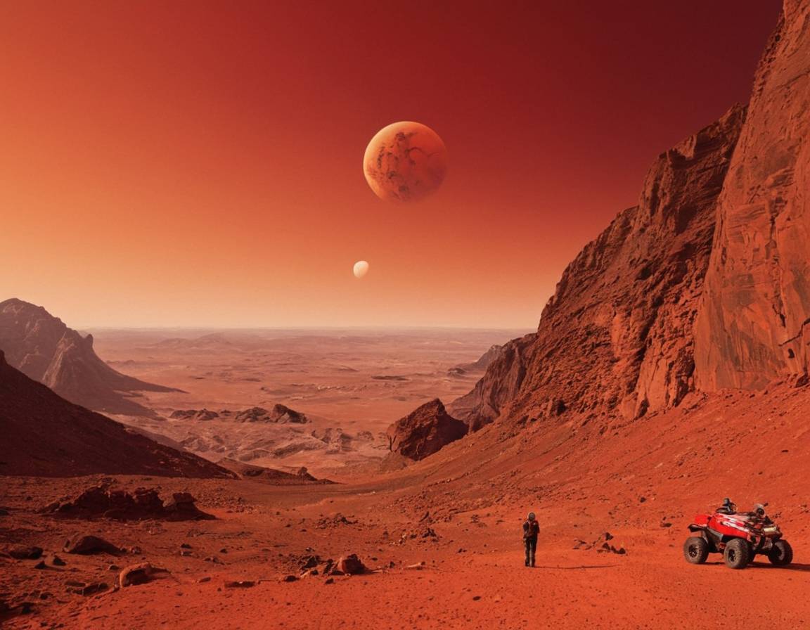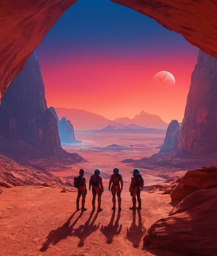 Вокруг царила невероятная красота, будто из другой футуристической реальности. Мы будто бы попали в научно-фантастический фильм в качестве главных героев. Жёлто-коричневая поверхность Марса была неровной: повсюду на панораме возвышались горы или виднелись впадины. Небо было красноватого оттенка, близкого к цвету крови – это немного пугало. Помимо синего Солнца на небе можно было заметить ещё два космических тела: спутники Марса Фобос и Деймос. Они коричневого и белого цвета.