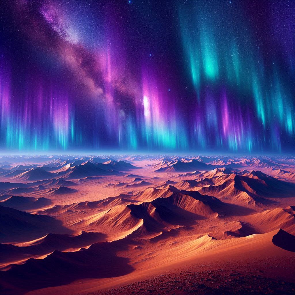 И правда, над Марсом в эту ночь можно было увидеть северное сияние, которое переливалось разными красками: фиолетовыми, синими, розовыми и так далее. Мы зачарованно любовались потрясающим небом над нами, когда из палатки вылез Аарон, до этого что-то настраивавший там.