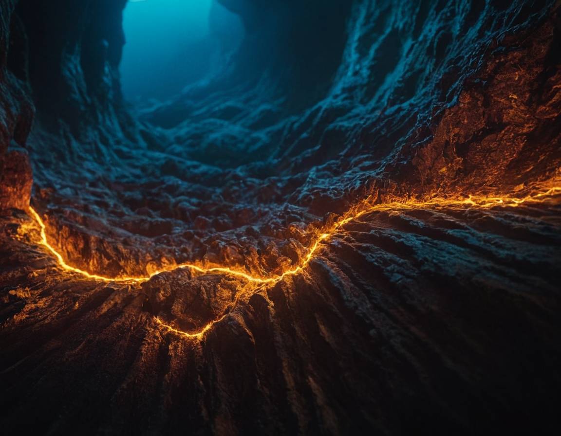 Когда Диомид пошёл дальше, в проходе стало совсем темно. Тогда он сделал и зажёг новый самодельный факел. Освещая им дорогу, в полу молодец увидел непонятные, но красивые трещины, кои глубоко внизу были окрашены в жёлто-оранжевый. "Что там такое? Лава?" – подумал Диомид, но было не разглядеть, что в них точно. Слишком узкие.