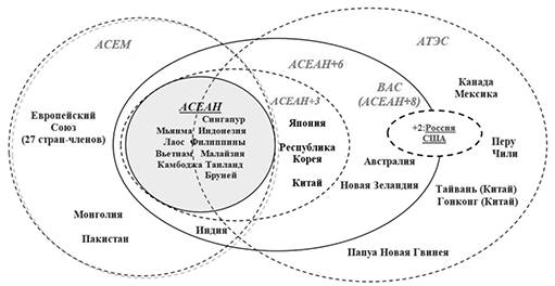 На протяжении последних 50 лет в Восточной Азии был создан целый ряд интеграционных объединений, таких как АСЕАН и АСЕАН + 1, и форумов международного сотрудничества, подобных АТЭС, а также разработаны концепции общерегиональных интеграционных объединений АСЕАН + 3 и АСЕАН + 6, проведен Восточноазиатский саммит в рамках АСЕАН + 8 и т. д. (см. схему 1). Практически для каждого из приведенных форматов взаимодействия на определенном этапе рассматривалась возможность его перерастания в полноценное интеграционное объединение, за исключением, пожалуй, АТЭС и АСЕАН + 8, куда в качестве полноправных членов входят и США, и Россия. Кроме того, активно развивается двустороннее и многостороннее взаимодействие в торговой, инвестиционной и прочих областях. Это, с одной стороны, свидетельствует о необходимости и неоспоримых преимуществах создания интеграционных блоков, а с другой – выступает дезинтегрирующим фактором, препятствующим созданию полноценного объединения.