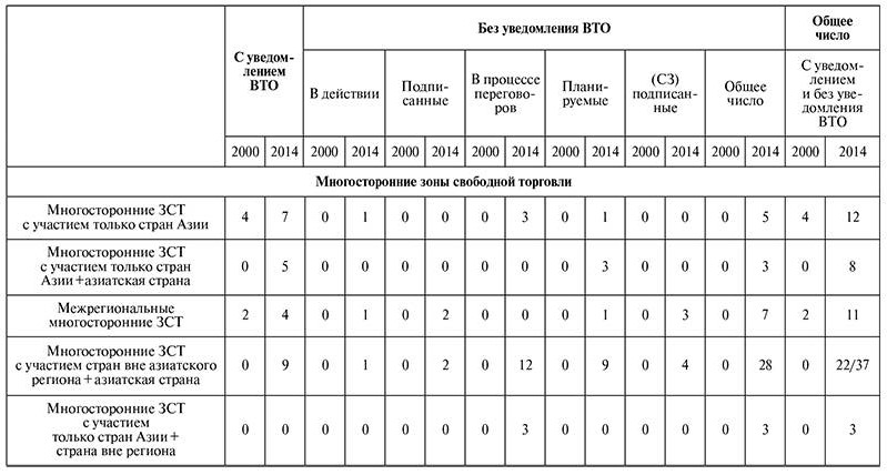 В последние годы рост числа заключенных двусторонних и многосторонних в рамках ограниченного числа стран соглашений обусловливался повышением активности таких пяти стран, как Япония, Китай, Республика Корея, Сингапур и Таиланд. Наиболее активным в этом отношении государством, располагающим обширными торговыми связями и комплексом соглашений, является Сингапур. По данным ВТО, к середине 2014 г. Сингапур подписал 40 региональных торговых соглашений, распространяющихся на торговлю как товарами, так и услугами47. Помимо того, что эта страна выступает участницей зоны свободной торговли АСЕАН, она заключила соглашения о свободной торговле с такими крупными экономиками региона, как Япония, Китай и Республика Корея, а также с США, Индией и Австралией. Япония заключила соглашения с пятью странами Восточноазиатского региона (Брунеем, Малайзией, Сингапуром, Филиппинами и Таиландом), а также с Мексикой и Чили48.