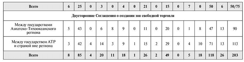 Характерной особенностью Азиатского регионализма является наличие большого числа двусторонних соглашений о свободной торговле. Это связано с решением АТЭС о целесообразности создания сначала небольших зон свободной торговли, которые впоследствии могут быть преобразованы в более крупные. Таким образом, наряду с расширением региональных торговых зон происходит их фрагментация, поскольку все большее число стран считают двусторонние соглашения более эффективным механизмом содействия торгово-экономическому партнерству. Государства более эффективно развивают двустороннее, а также многостороннее сотрудничество в рамках нескольких участников на основе заключения соглашений по отдельным направлениям экономического развития. В 2002 г. было подписано Соглашение об экономическом партнерстве между Японией и Сингапуром, которое в 2003 г. переросло в соглашение о зоне свободной торговли товарами и услугами. Кроме того, соглашения о зоне свободной торговли были подписаны между КНР и Макао (САР КНР), а также КНР и Гонконгом (САР КНР) в 2003 г., между Японией и Малайзией в 2005 г., между Республикой Корея и Сингапуром в 2005 г., а также между Республикой Корея и Филиппинами в 2006 г.45