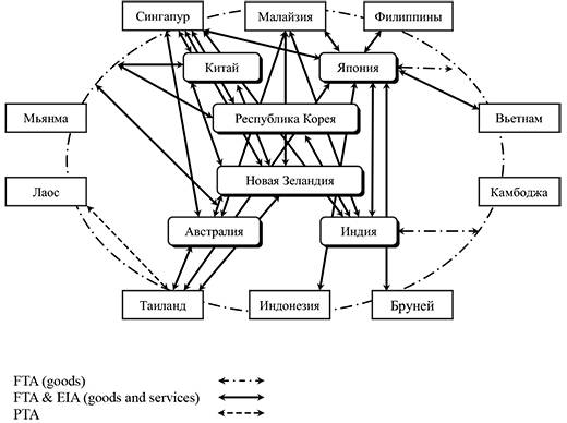 Все двусторонние региональные торговые соглашения, заключенные между наиболее развитыми в экономическом отношении странами АСЕАН, а также большинство многосторонних соглашений формата АСЕАН + 1, распространяются как на торговлю товарами, так и на торговлю услугами, имея при этом статус FTA & EIA (Free Trade Agreement + Economic Integration Agreement). Исключение составляют зоны свободной торговли АСЕАН с Индией и Японией. При этом соглашения с участием наименее развитых стран АСЕАН, в частности соглашение между Лаосом и Таиландом, имеют форму PTA – преференциальных торговых соглашений. Само же объединение АСЕАН + 6 в соответствии с классификацией АБР имеет статус Соглашения об экономическом партнерстве (EPA)55.