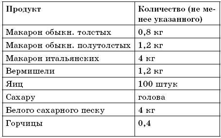Для семьи в 4-6 человек (для семьи в 10 и 15 человек нужно запасать вдвое и втрое более) достаточно иметь в запасе: