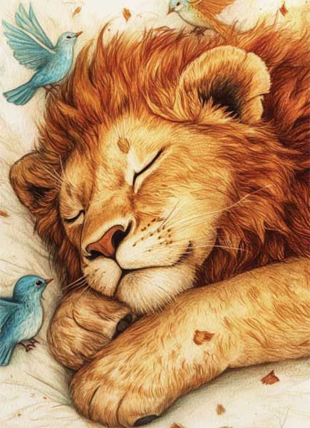 Лев, ни о чём не помышляя, спокойно и безмятежно спал, и ему снились львята, которые прыгали по его спине и теребили хвост.