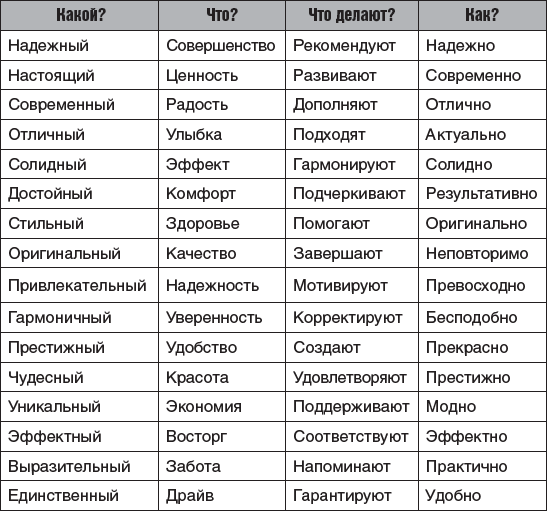 Продающие словаЕсть такое понятие, как «продающие» слова и фразы. Что с ними делать? Распечатайте и повесьте на видное место над столом. Каждое утро, обед, вечер читайте. Чтобы у вас в голове оседали эти слова и фразы, чтобы речь была разнообразной.