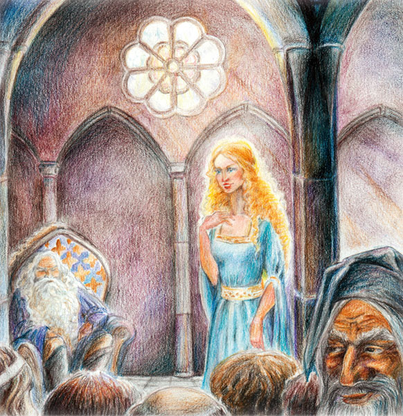 Элиза вышла в нежно-голубом платье, с распущенными по плечам светлыми кудрями. Наверное, только камень мог бы не влюбиться в такую красавицу. Все ахнули, по залу прошел восхищённый шёпот.